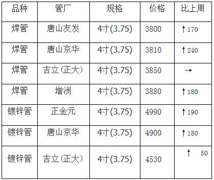 唐山地區大部分管廠焊鍍管出廠報價大幅上調,甚至出現一天內連續上調三次的罕見情況,受此帶動市場情緒有所好轉。但隨著價格持續拉高,觀望情緒不斷增濃,成交有所減弱,臨近周末唐山地區管廠報價有漲有跌,整體出貨情況不理想,螺旋焊接鋼管價格暗降現象較明顯,鍍鋅管因資源有限價格相對堅挺。唐山主流管廠出廠價格如下:
